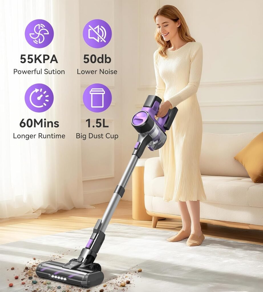 - π¨ 50 kPa strong suction power β deep cleans carpets, rugs, and hard floors.